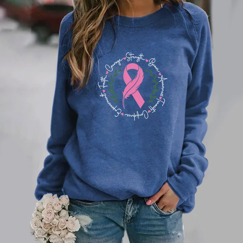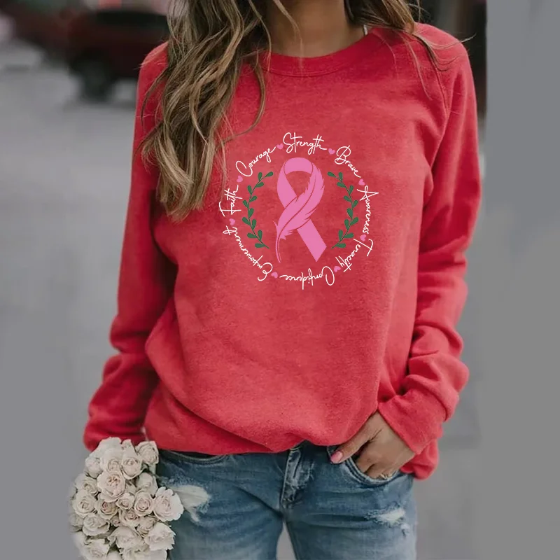 the EMPOWERED - Awareness Ribbon Breast Cancer Pullover Women's Fashion Faith Hope Love Long Sleeve Crew Neck Sweatshirt Top