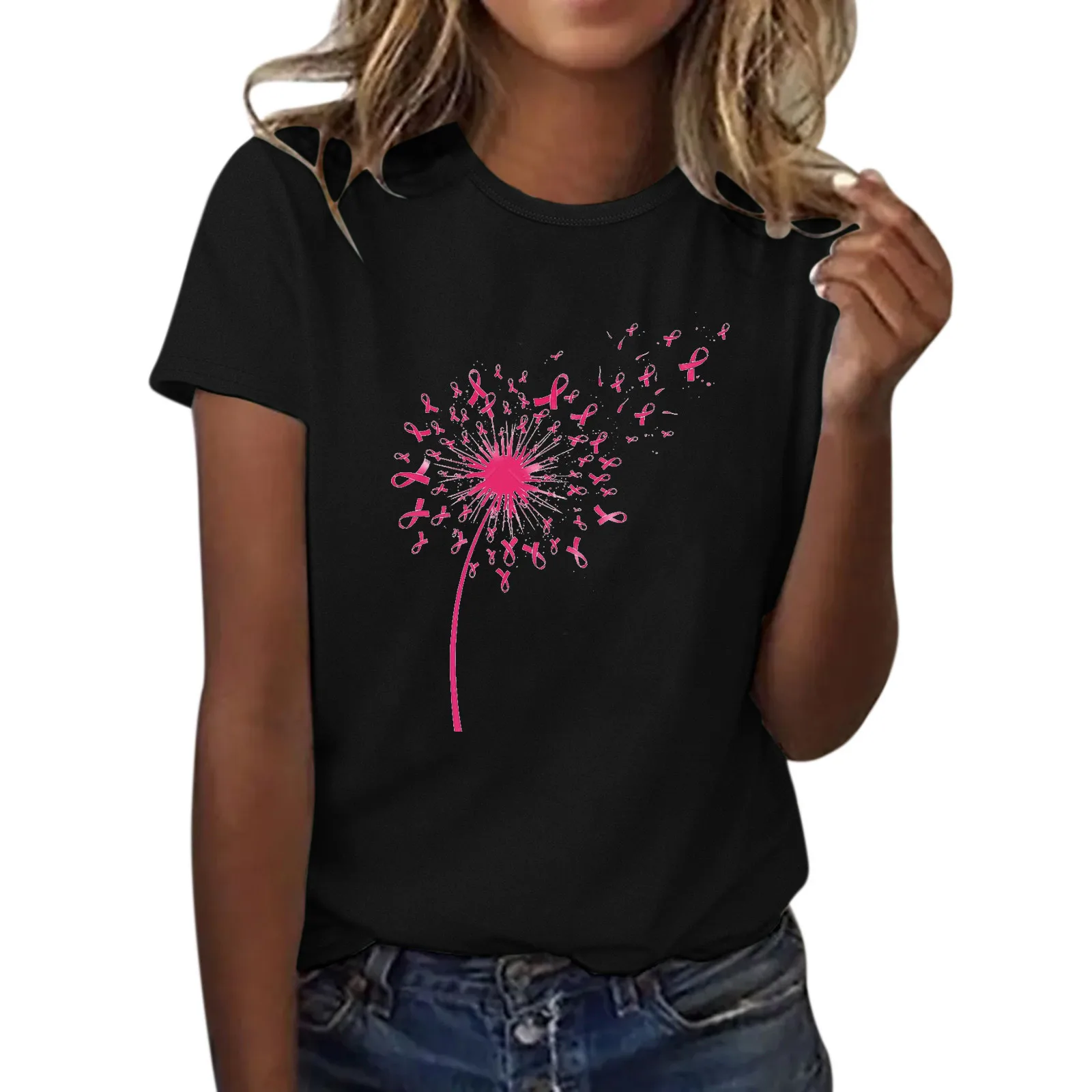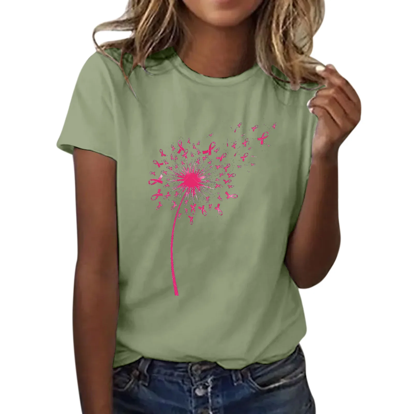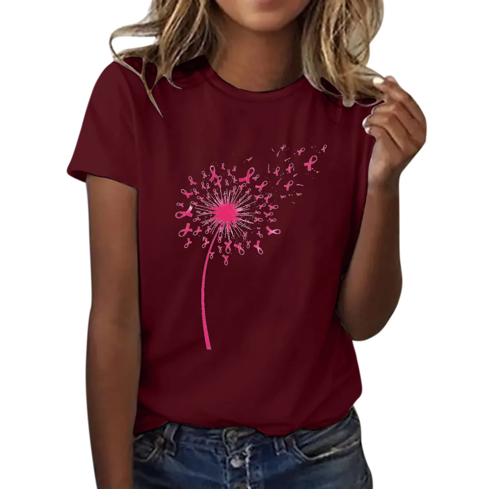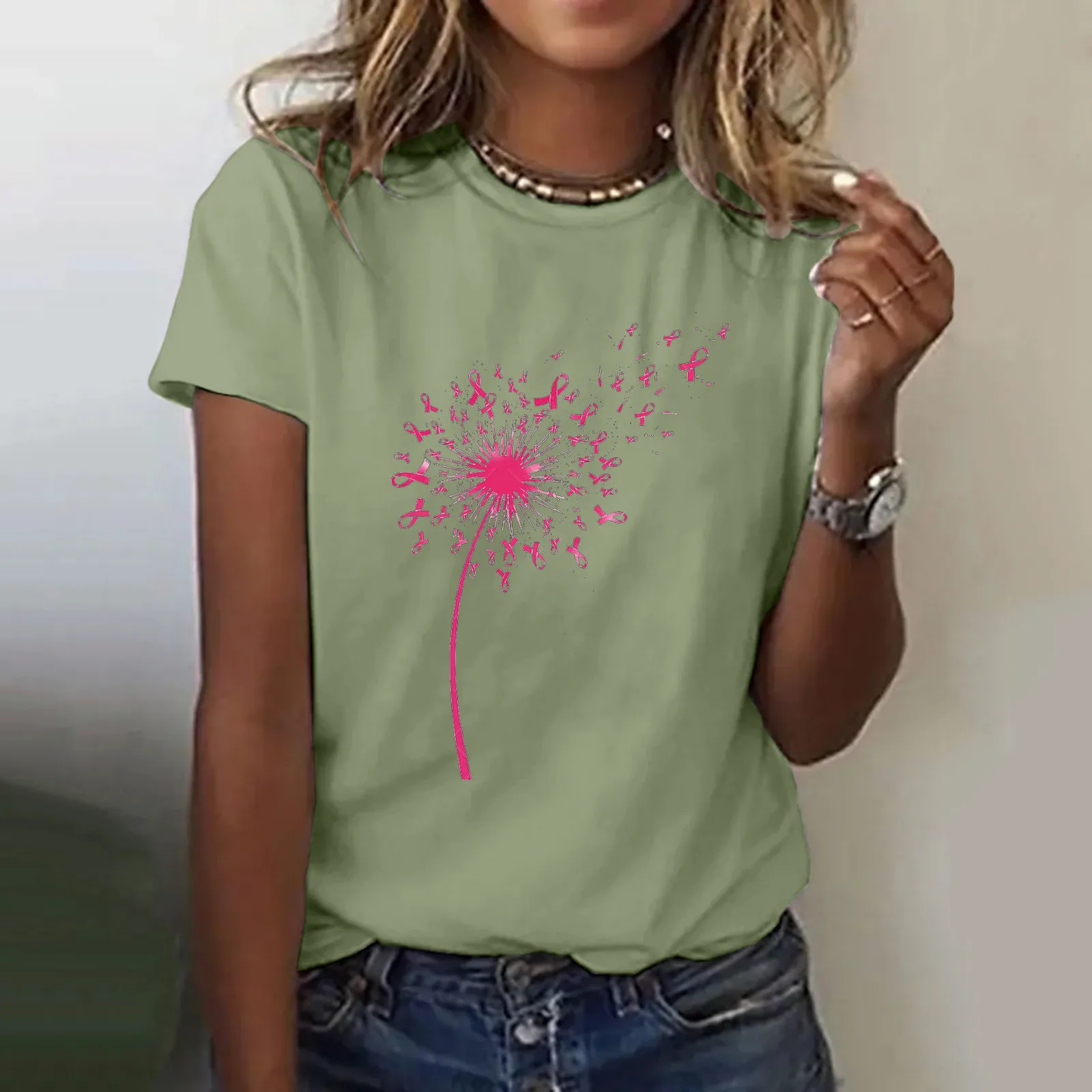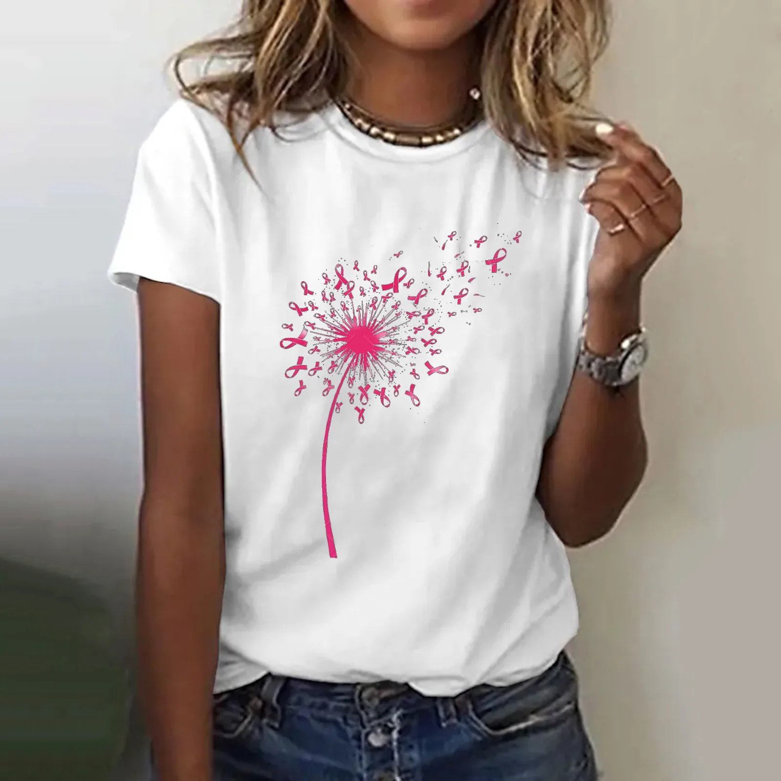 the RIBBON DANDELION - Pink Ribbon Dandelion Print Casual Tops for Women